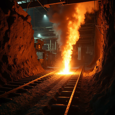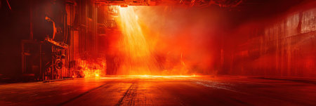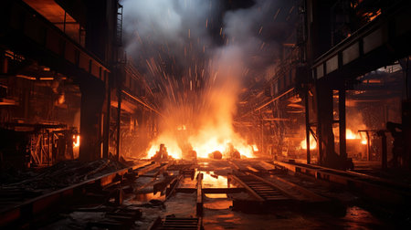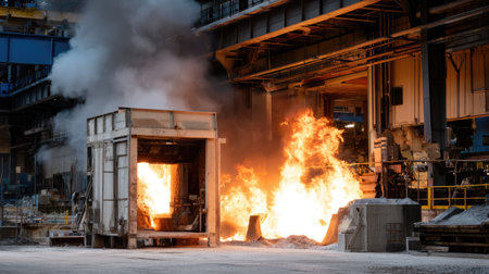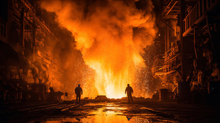 Dramatic scene of molten steel explosion inside an industrial steel plant with blazing fire.
