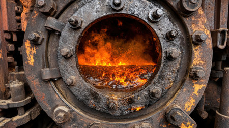Close-up view of an industrial furnace door displaying vibrant flames and textured rust, emphasizing the raw power of energy production and heat generation.