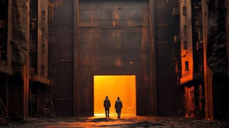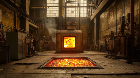 This striking image showcases an industrial furnace in an abandoned factory, with molten metal glowing in the foreground. The atmosphere is filled with shadows, smoke, and a sense of decay, offering a glimpse into manufacturing's powerful and hazardous nature.