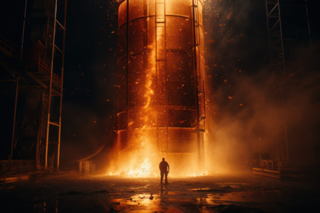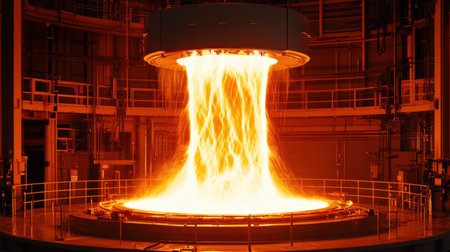 Vibrant image capturing a high-tech industrial environment with dynamic orange flames erupting from a machine, showcasing energy and innovation.