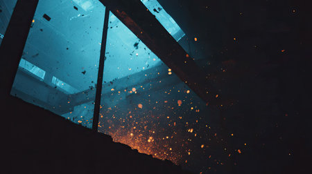 This captivating image captures a dynamic scene of sparks and falling debris illuminating an urban environment. The interplay of light and shadow adds depth and drama.