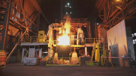 An industrial furnace releases bright flames and molten steel, showcasing the intense heat and activity of nighttime metal production.