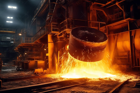 This striking image captures the intense heat and glowing allure of molten metal within an industrial foundry. The fiery orange hue highlights the energy of the steel production process, showcasing a vibrant and dynamic manufacturing environment.