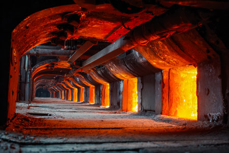 Intense lava flow glows in a dark industrial furnace, showcasing vibrant orange flames and molten materials. A captivating display of energy and heat in action.