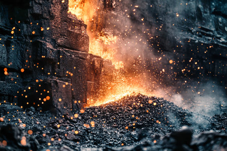 Captivating image showcasing the intense eruption of molten metal, surrounded by a dark industrial environment filled with sparks and flames.