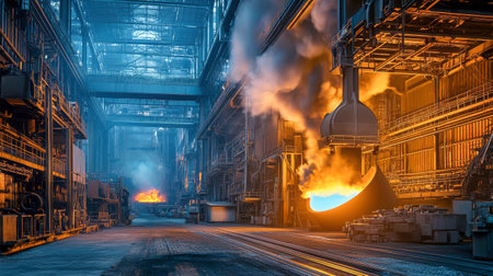 A dramatic industrial scene showcasing molten metal pouring from a furnace, surrounded by smoke and flames, in a bustling manufacturing facility.