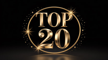 A golden emblem with the text TOP 20 inside a circle, surrounded by stars and sparkles on a black background.