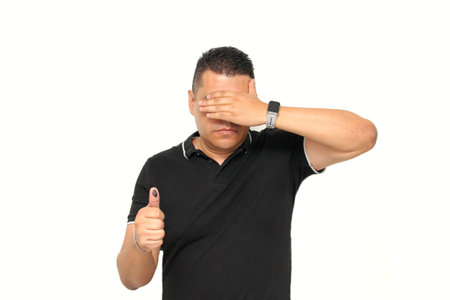 Dark-skinned Latino adult man shows his thumb inked with indelible electoral ink after marking his free and secret vote in the box