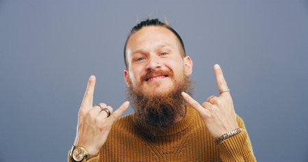 Rocker, hand and cool with man in studio for metal music, punk identity and space. Devil horn sign, edgy and attitude with portrait of happy person on background for smile, emoji and expression