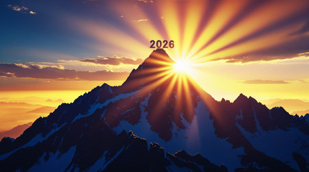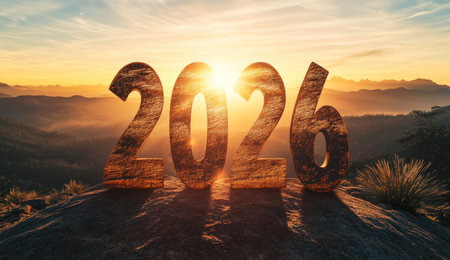 The number 2026 is carved in the silhouette of mountains, with sunlight shining on it and giving off a golden glow. The background features distant scenery and wispy clouds. In front of the sunrise, there's an atmosphere full of hope for the new year. --ar 26:15 --v 6.1 Job ID: 0b95da82-1b7d-4cd8-a83d-ff9045472a74