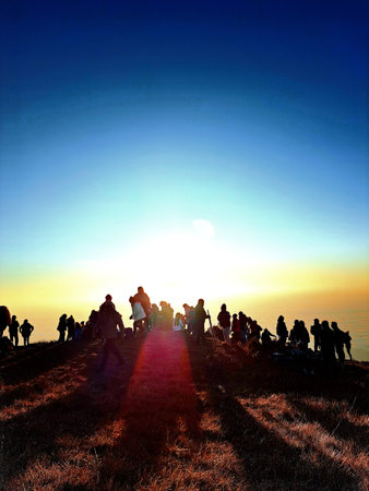 Silhouette of a group of tourists on the top of the mountain