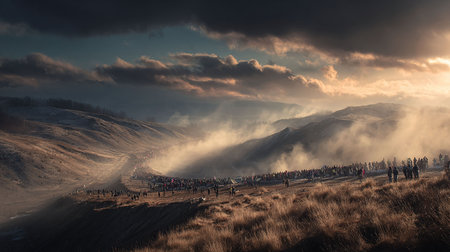 An image illustrates the concept of achieving goals, depicting a path up a mountain. The visual characteristics include a detailed landscape with warm colors, suggesting a sunset or sunrise. This metaphorical representation uses lighting to highlight the goal, ideal for commercial projects related to motivation and achievement.