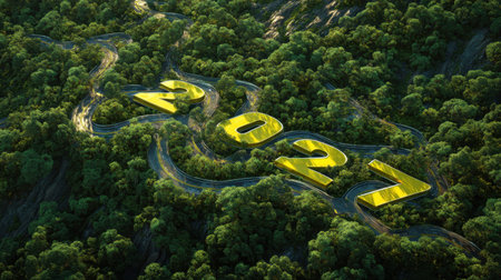 A captivating view of a winding road in a lush green forest, where bright yellow numbers symbolize the upcoming year 2027. Ideal for themes of growth and adventure.