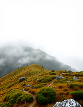 Mountain landscape with grass and fog on the top of the mountain