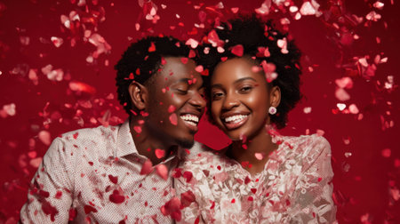 A joyful couple celebrating Valentine's Day, radiating happiness with warm smiles amidst a flurry of heart-shaped confetti, embodying love and connection.
