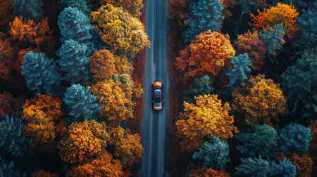 Car driving along winding road through a vibrant colorful autumn forest landscape during a scenic road trip journey Scenic natural beauty of the fall season