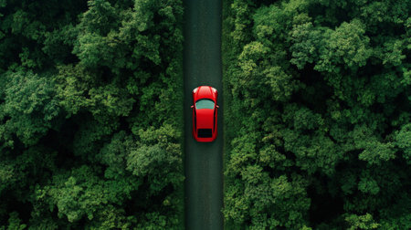 Aerial view of a red car driving down a narrow asphalt road through a dense green forest, showcasing the contrast between nature and transportation