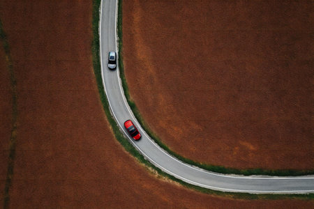 A red car driving on the winding road in a green forest, aerial view, high-angle shot, high-resolution photography, insanely detailed, fine details, isolated plain background, stock photo color grading, cinematic lighting, cinematic. --ar 53:30 --v 6.1 Job ID: 1d3fcf5f-550a-4f3c-84b9-847ff4e83f1a