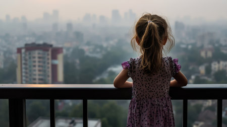 A young girl gazes at city skyline from balcony