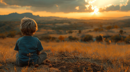Lonely Child Looks at the City from Hill, Sad Small Girl at Sunset, Blurred Background, Copy Space, Generative AI Illustration