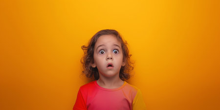 Curious child with wide eyes on yellow backdrop