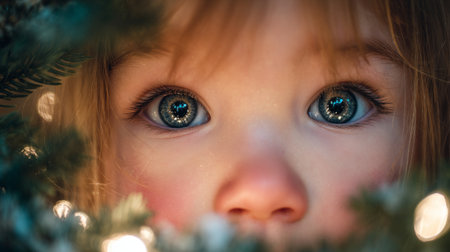 Captivating blue eyes of a child glancing through festive greenery with twinkling lights