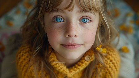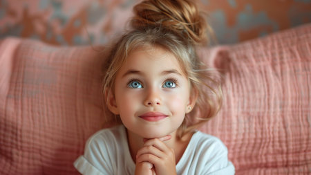 A captivating portrait of a thoughtful girl with blue eyes, exuding innocence and curiosity. The soft lighting enhances her emotive expression, creating a serene atmosphere.