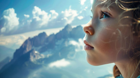 A young girl in contemplation, looking at a majestic mountain landscape under a clear blue sky. AIG50