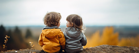 Back view of two little toddlers sitting on a trunk looking at autumnal landscape