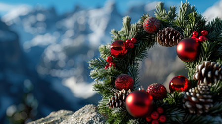 A stunning Christmas wreath adorned with red ornaments and pine cones, contrasting beautifully against a breathtaking snowy mountain backdrop. Perfect for holiday themes.