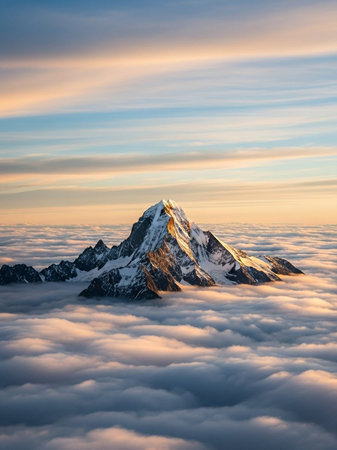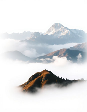 A stunning view of a solitary mountain peak enveloped in mist and fog. The serene landscape embodies tranquility, making it perfect for nature enthusiasts and wanderers.