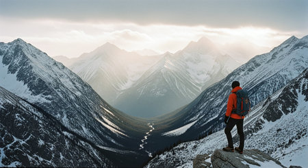 Hiker on top of a mountain with a backpack and looking at the valley.