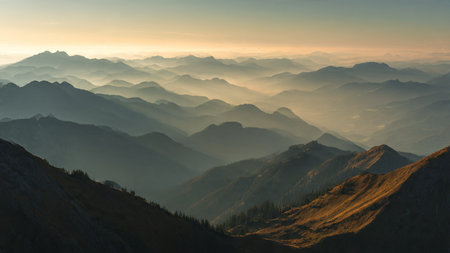 This stunning image captures a snow-capped mountain range bathed in soft morning light. The mist adds a tranquil touch to the expansive landscape, inviting exploration.