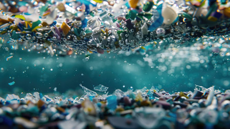 Background with microplastic particles floating in ocean or sea water. Environmental plastic pollution problem of rubbish and trash