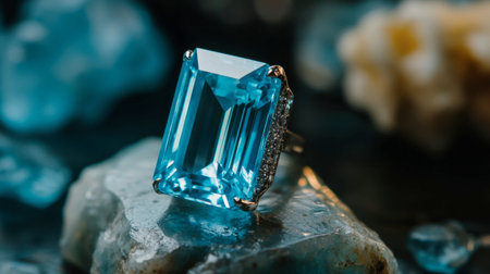 A stunning emerald cut blue gemstone ring set against a textured backdrop. This elegant piece showcases its brilliance and unique design, perfect for jewelry lovers.