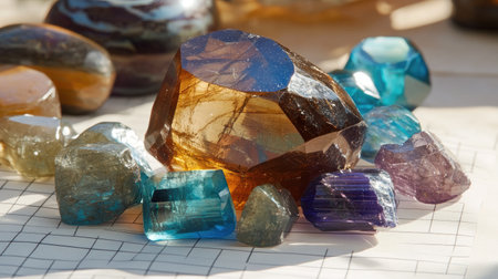 A captivating display of colorful gemstones spilling from a jar onto a shimmering surface, illuminated by soft natural light, showcasing their vibrant hues and sparkling clarity.