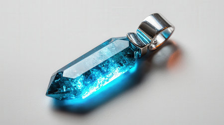 Crystal pendant glowing with blue neon light, isolated on white, ideal for enchanted jewelry designs