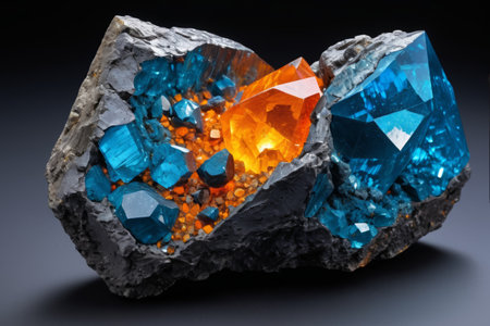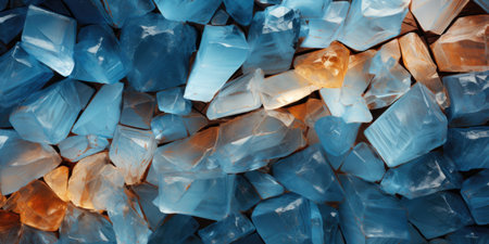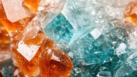 This close-up image showcases a stunning arrangement of colorful crystalline minerals in vibrant shades of blue and orange, featuring intricate patterns and sharp edges.