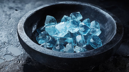 Beautiful blue gemstones displayed in a dark bowl on a textured surface