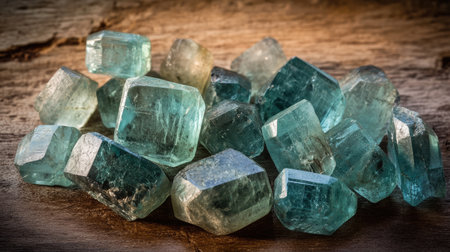 A captivating assortment of raw aquamarine crystals showcased on a wooden surface, highlighting their mesmerizing colors and unique structures, ideal for nature enthusiasts.