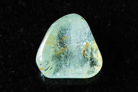 sample of tumbled blue topaz mineral on black granite background close up from Namibia