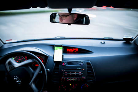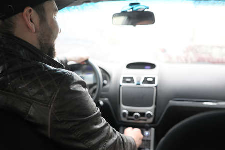 Driver in the car controls the navigator. Close-up part