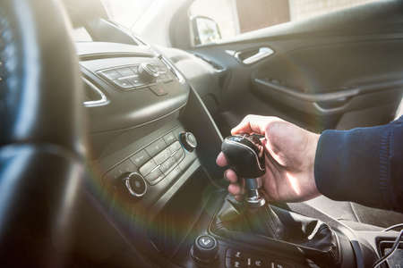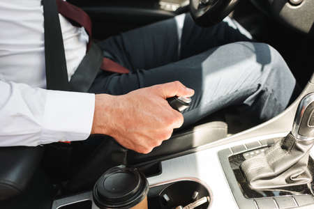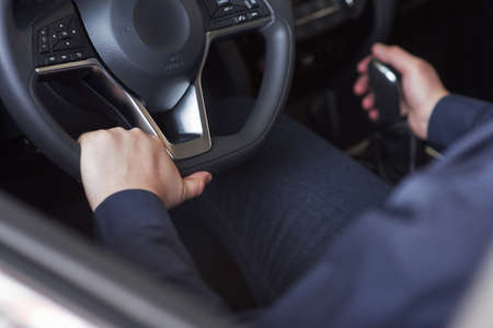 Gear shifting. Man in official clothes trying his new car in automobile salon.
