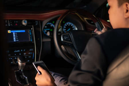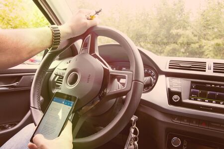 Using a mobile phone in a traffic jam while driving a car. A person writes a message in the messenger sitting behind the wheel, close-up