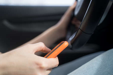 Woman using mobile smartphone while driving danger and risk of accidents concept,copy space the left steering wheel selective focus.