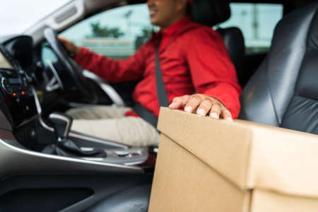 Delivery man driving truck to send the parcel cardboard. Red uniform messenger service courier the package by van.