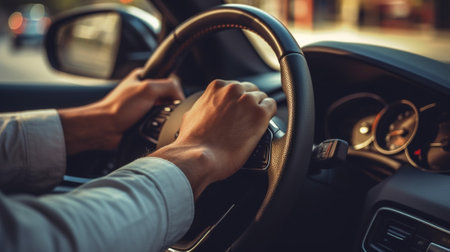 Driver navigates city streets during golden hour in a modern car capturing the essence of urban life and adventure on the road ahead