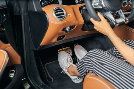 Close up the foot pressing foot pedal of a car to drive. Accelerator and brake pedal in a car. Driver driving the car by pushing accelerator and break pedals of the car. inside vehicle. control pedal.