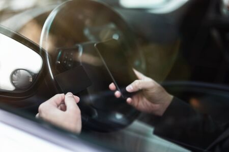 man making online payment in his smartphone using bank card while sitting in his car, online banking service concept.