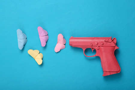 Love layout made with pink gun firing origami butterflies on blue background. Creative valentines or romantic concept. Flat lay, top view.
